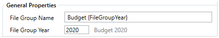 Either of these variables can be used in the file group name, so that the current file group year is always reflected in the name (for example, "Budget 2022"). You can type the variable into the File Group Name field directly, or you can click the use in file group name link that displays to the right of the box after the file group year is defined. (If you want to use the ShortFileGroupYear in this field then you must manually type the variable.)