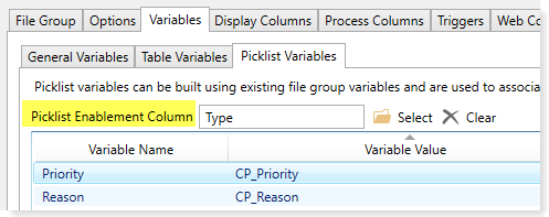 Picklist Enablement: If a Picklist Enablement Column has been defined for the file group, you can specify the values in that column for which this picklist variable should be enabled. For more information, see Dynamically enabling picklists.