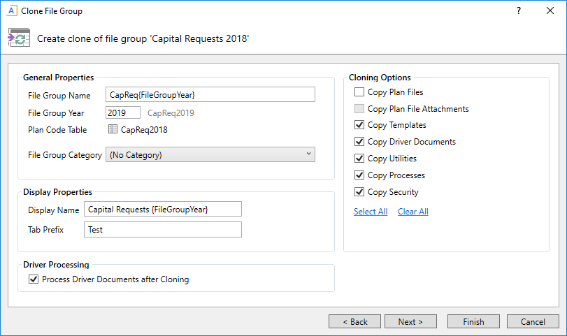 The Clone File Group dialog opens to guide you through the cloning options. Complete each screen as needed, and then click Finish to create the new file group.