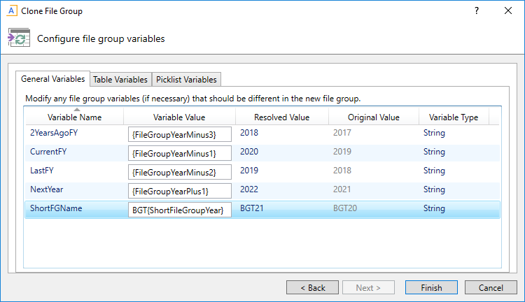 Review the file group variables and make any necessary changes for use in the new file group. For each variable, you can see the new resolved value and the original value for comparison. Make sure to review all three tabs: General Variables, Table Variables, and Picklist Variables.