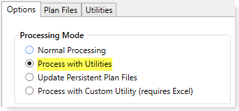 If the file group is configured so that utility processing is the default processing mode, then this mode is selected by default. This is controlled by the Process Plan Files with Utilities option in the file group properties.