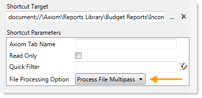 You can perform file processing on a report file directly from a custom task pane or ribbon tab, by linking to the file and then using shortcut parameters to trigger file processing. You can choose to perform either regular file processing or multipass file processing.