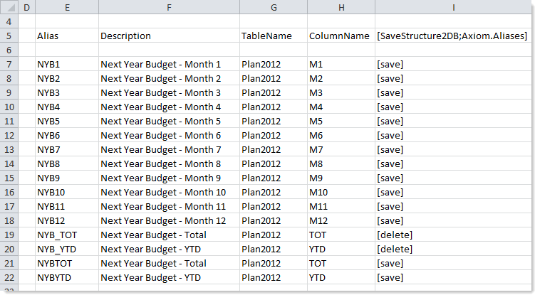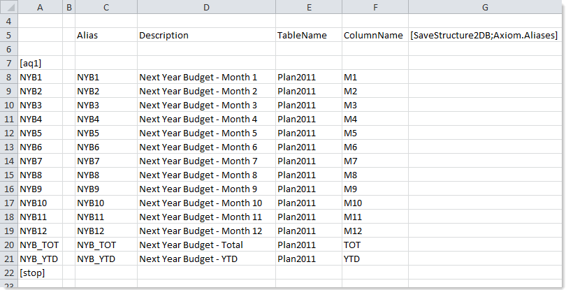 The next example shows how an Axiom query could be used to bring in the current alias names as a starting point. Row 5 can double as both the field definition row for the query, and as the control row for the save-to-database operation (the query will ignore the save tag in row 5).