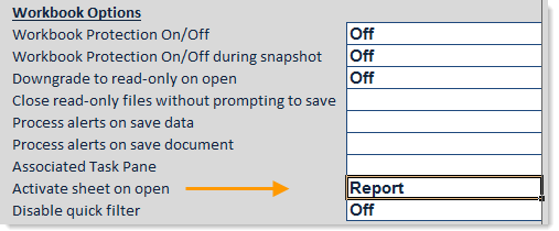 When the file is opened, the sheet designated here will be the active sheet, regardless of which sheet was active when the file was last saved. This option is useful to keep the active sheet consistent for end users, rather than accidentally set it to whatever sheet the file designer is working on.