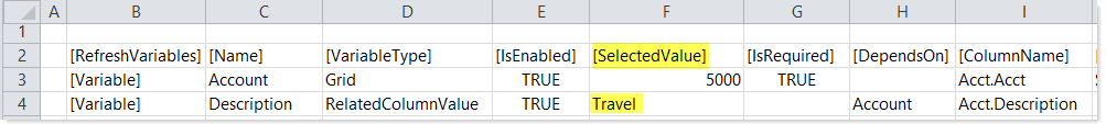 In this example, the RelatedColumnValue variable named Description depends on the Grid variable named Account. The Description variable is configured to return the value for Acct.Description based on the selected account for the Account variable.
