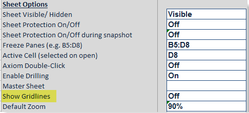 To set the visibility of gridlines, use the Show Gridlines property in the Sheet Options section of the Control Sheet. This property can be set as follows:
