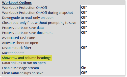 To set the visibility of row and column headings, use the Show row and column headings property in the Workbook Options section of the Control Sheet. This property can be set as follows: