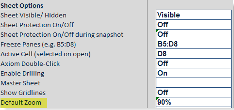 You can specify the default zoom level for each sheet in an Axiom file. To set the zoom level, use the Default Zoom property in the Sheet Options section of the Control Sheet. Enter a percentage as an integer, with or without a percentage sign—for example, either 90 or 90% is valid.