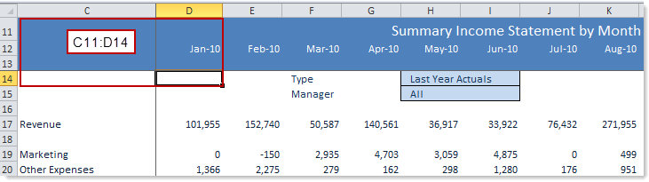 The frozen panes start at the first cell in the range (C11) and then continue to the top and left of the last cell in the range (D14). When you scroll across, column C is always frozen onscreen. When you scroll down, rows 11-13 are always frozen onscreen.