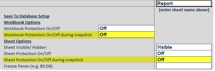 - Workbook Protection On/Off during snapshot: This setting is located in the Workbook Options section of the Control Sheet. By default it is set to Off, which means snapshot copies will not have workbook protection applied.