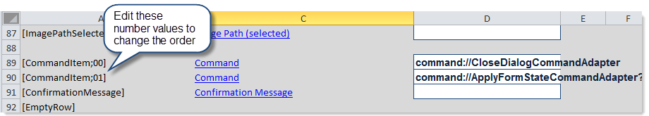 • Alternatively, you can manually change the order number of the commands as detailed in column A of the Form Control Sheet. The command tags in column A use the following syntax: