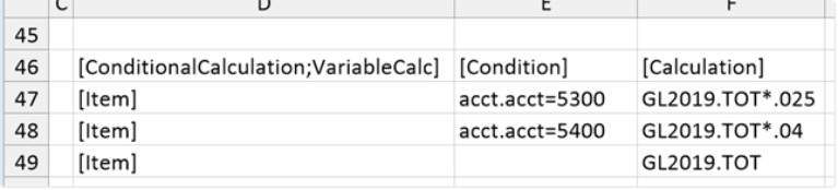 When the report is rendered, each row is evaluated against the conditions in the ConditionalCalculation data source to determine which calculation to use. In this example, rows matching account 5300 use the first defined calculation, and rows matching account 5400 use the second calculation. All other rows use the final calculation with a blank condition.