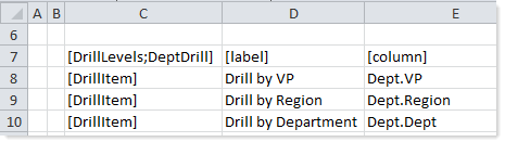 • Create a [DrillLevels] data source on any sheet within the form-enabled file. The data source defines the columns that can be used to drill, and the display text to show to users for each option.