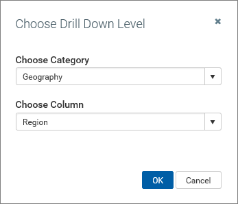 When hierarchies are used, users first select a category (the hierarchy) and then select a column in the hierarchy. In the following example, the user has selected the Geography hierarchy and then the Region column, so the drilling data will use regions as the rows.