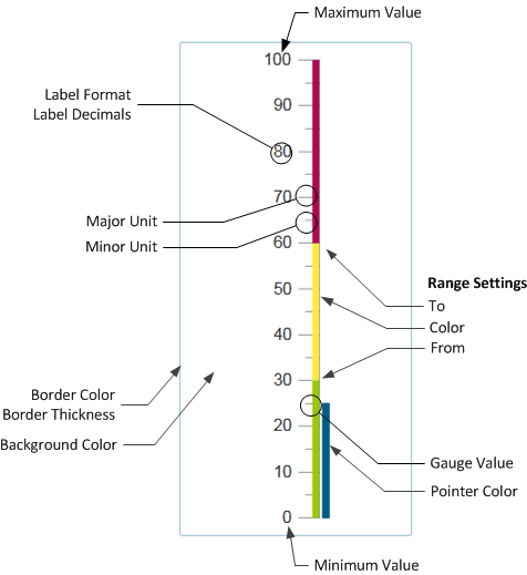 You can define the following properties for a Linear Gauge component. The following screenshot shows an example gauge with the major properties that impact the display: