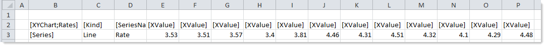 - Creation of an XYChart data source in the spreadsheet to define the data to display in the chart.