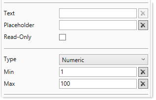 To configure a Text Box component for numeric input, set the Type property to Numeric. You can then configure the following options: