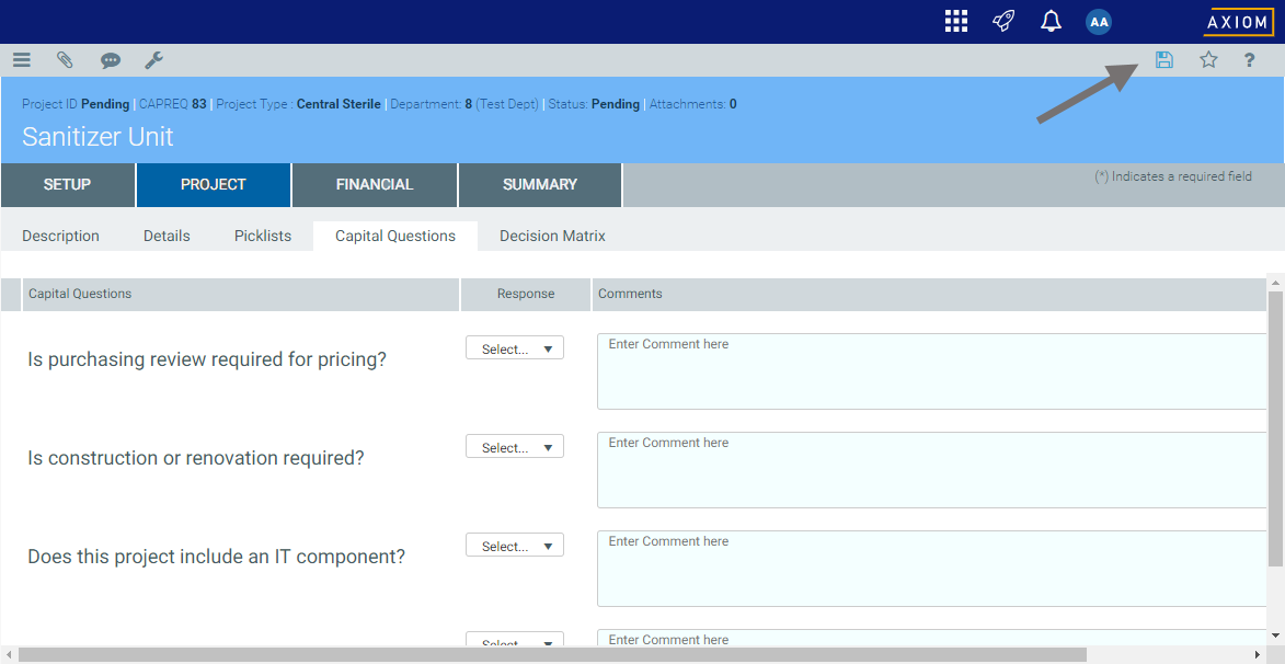 • Set up a text box within the Axiom form, where the user will enter their comment. This could be a stand-alone Text Box component, or a TextArea tag within a Formatted Grid component. You would likely define placeholder text for the text box; in this case, something like "Enter a comment".