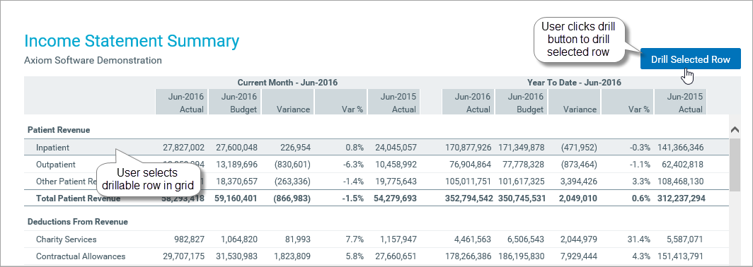When the drill button is clicked, Axiom Enterprise Decision Support reads the Selected Row ID for the grid, and initiates a drill based on that row. The drilling choices are displayed as normal, and the separate drill results page is opened as normal.