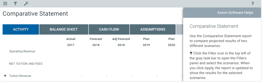 When a help code is specified in the form properties, the help icon in the right-hand side of the Task Bar The gray bar that displays across the top of browser-based Axiom files, as well as various feature pages of the Web Client. The Task Bar provides access to various tasks that are specific to the current area, page, or document. opens a help panel to show the associated help text, instead of opening Axiom Enterprise Decision Support Help.