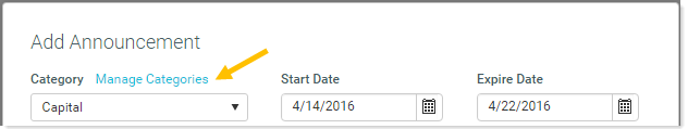 Categories can be created, edited, and deleted from the Add Announcement or Edit Announcement dialog. Click the Manage Categories link above the Category drop-down list.