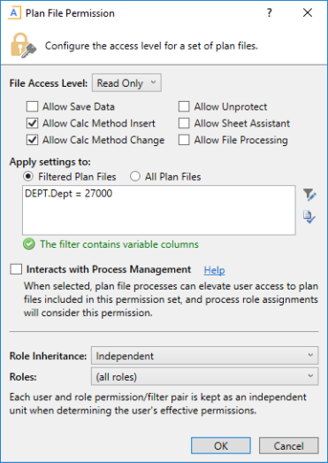 If a user has only one defined permission set and that permission set is configured to combine with a specific role, the user will not inherit any additional plan file permissions from other roles. If you want the user to inherit permissions from other roles independently, you can create a "dummy" permission set for the user that has no permissions, but is configured with Independent inheritance.