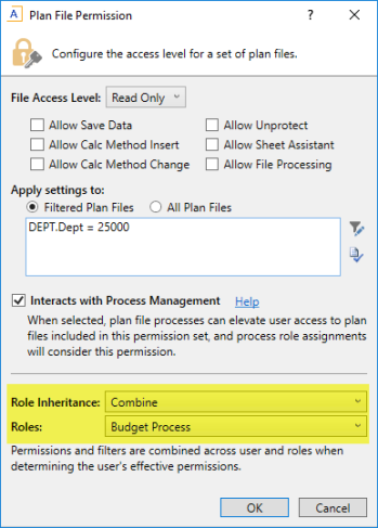 Now imagine a user who belongs to two roles, Budget Process and Finance. The Budget Process role does not grant the user any particular plan file permissions, but the Finance role includes the plan file in its filter and also has Interacts with Process Management enabled. If Budget Process is assigned as the step owner, then the user will be a step owner due to the permission they inherit from the Finance role. The user's membership in Budget Process makes the user eligible to be a step owner, and then at that point all permission sets for the user are evaluated to determine whether they will be a step owner.