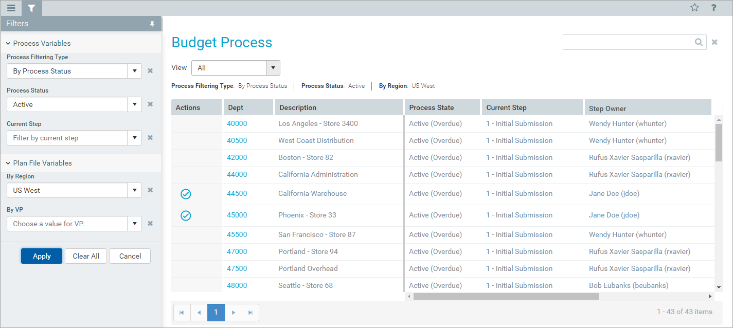 When a user views the Process Directory page, they can use the Filters panel to filter the list by the variables: