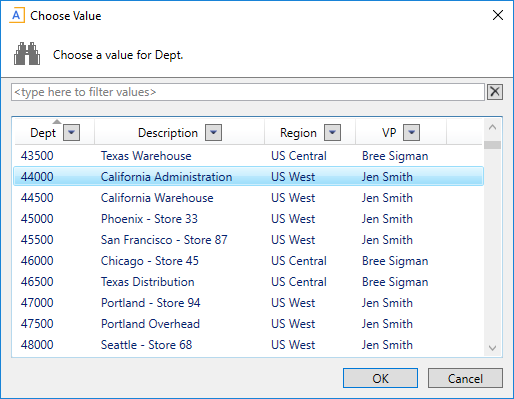 The Choose Value dialog allows users to select a value from a table when using the following features: