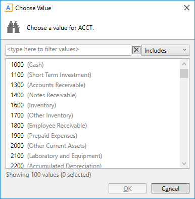 In both cases, users can type into the filter box at the top of the dialog to search for values in the list. All visible columns are included in the search. By default, the filter box uses Includes matching, which means that it will match any value in the list that includes the value in the filter box. For simple view dialogs only, the user can switch this matching behavior to Starts With or Ends With if desired.