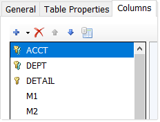 In the Edit Table dialog, key columns display with a yellow key icon next to the column name. If the key column is also a validated column, then the icon is a yellow key and a blue key combined.
