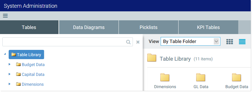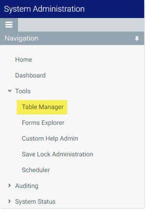 NOTE: The System Administration menu item is only available to administrators and to users with special permissions to various features in the system administration area. However, any user can access the Table Manager area if they use the direct URL. Once a user accesses the Table Manager, what they can see and do is controlled by their security permissions.