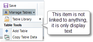 Manage Tables button: Because the Manage Tables parent item is not linked to a command, clicking that button does not perform an action. Instead it brings up a drop-down menu where users can open the Table Library or add a table.