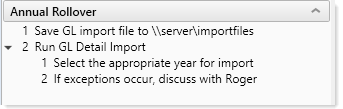 This property is only available to task panes that are stored in file group Utilities folders, and can only be configured by product developers. The property is only visible in client systems as read-only, and only if the task pane is part of a product-installed solution with a configured usage key. This feature is intended to be used when plan files have an associated task pane, but some items in the task pane need to dynamically show and hide depending on the individual plan file. For example, some items in the task pane may only apply to certain department types or certain types of capital requests. To accommodate this, a formula can be used to dynamically change the usage keys appended to the document path for the associated task pane. If an item in the task pane has a defined usage key, and that key is not appended to the document path, then the item is hidden in the task pane. Items without a usage key always display. |