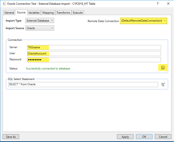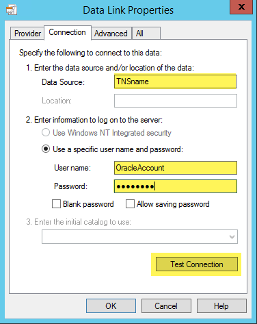 On the Connection tab, enter the appropriate TNS name and Oracle login information, and then click Test Connection.