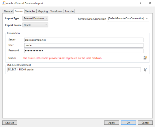 Example error when ODAC is not installed on Axiom Cloud Integration Server