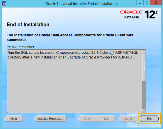 On the End of Installation screen, click Exit. It is not required to run the SQL scripts.