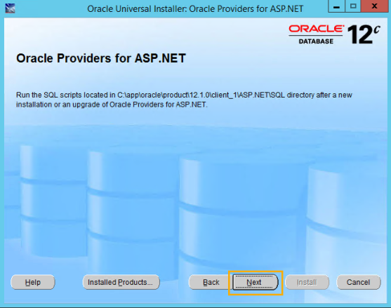 On the Oracle Providers for ASP.NET screen, click Next. It is not required to run the SQL scripts.