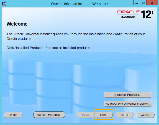 On the Welcome screen of the Oracle Universal Installer, click Next.