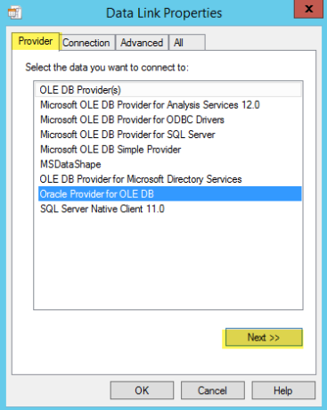 In the Data Link Properties dialog, on the Provider tab, select Oracle Provider for OLE DB from the list, and then click Next.