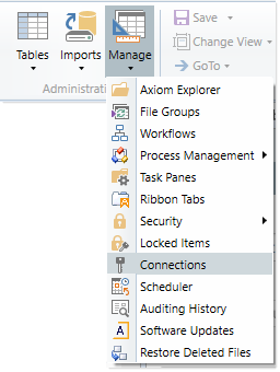 On the Axiom tab, in the Administration group, click Manage > Connections.