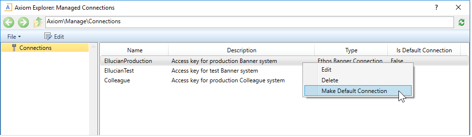Using the Managed Connections dialog, you can create, edit, and delete Ellucian Ethos connections for Banner and Colleague systems. You can also specify a connection as the default connection (one per connection type), so that imports which are configured to use the default connection will use that connection.