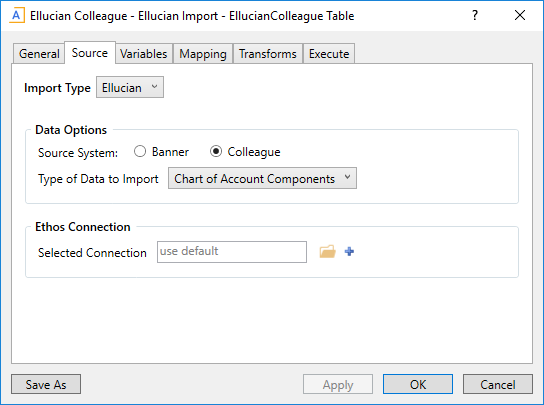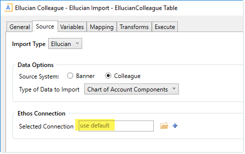 NOTE: The Ellucian import cannot be saved if it does not have a valid connection. If the import is configured to use the default connection, but there is no designated default connection for the source type, then in order to save the import you must either select a specific connection or create a new one. It is not possible to designate a default connection from within the Import Wizard dialog; this can only be done in the Manage Connections dialog. Once a default connection of the appropriate type has been specified, you can come back to the Import Wizard and clear the connection assignment in order to revert to using the default connection.