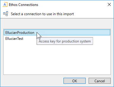 In the Ethos Connections dialog, select the name of the connection to use, then click OK.