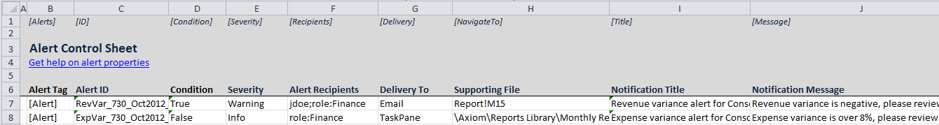 The default format of the Alert Control Sheet is provided for your convenience. However, you can set up this sheet however you like; you do not have to use this format. For example, you may want to define alerts using an Axiom query instead of "hard-coding" them into the default grid. If so, then you can set up an Axiom query on the Alert Control Sheet. As long as each column has the appropriate alert header tag (as shown in row 1 above), and each alert row is flagged with an [Alert] tag, then alerts can be placed anywhere on the sheet. However, all alerts must be defined on the Alert Control Sheet—you cannot define them on other sheets in the file.