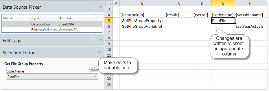 To edit an existing data lookup row, place your cursor within the row, in the data source—either on the row tag or in one of the parameter columns. The parameters for the variable display in the Selection Editor section of the Data Source Assistant, filtered by row type. You can modify any of these parameters and the changes are written back to the sheet, into the appropriate columns.