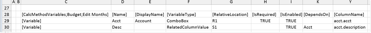 For example, imagine that you are prompting users to select an account to place in the calc method, and you also want to place the account description in the calc method. To do this, you first set up the parent variable to display a list of accounts. Then, you create a RelatedColumnValue variable to return the account description, and configure it as dependent on the parent Account variable.