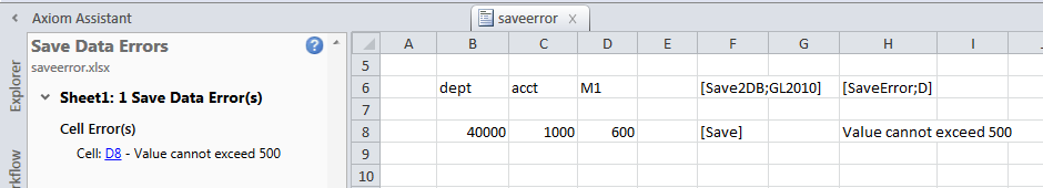 In the following screenshot, the value has been changed to 600, which exceeds the threshold. An error message now displays in the [SaveError] column, so the save-to-database process is stopped and the error message is displayed to the user in the task pane. Because the [SaveError] tag contains the column letter D, the error directs the user to the specific cell with the problem: D8. If no column was indicated in the tag, then the user would be directed to row 8.