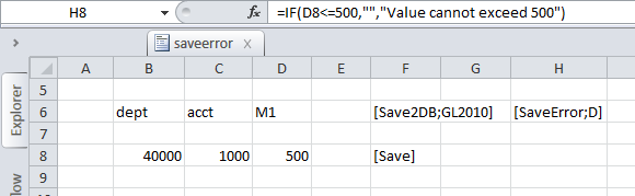 The following example shows a simple save-to-database process with a [SaveError] tag to the right of the [Save2DB] tag. The validation condition, shown in the formula bar, tests whether the value in cell D8 exceeds 500. Because the value is currently 500, the value meets the condition and the [SaveError] column is blank. When the user saves, no error will be triggered.