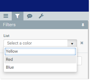 • A comma-separated list of values to display in the list. For example: Yellow, Red, Blue. (Alternatively, semicolons can be used as the delimiter.)